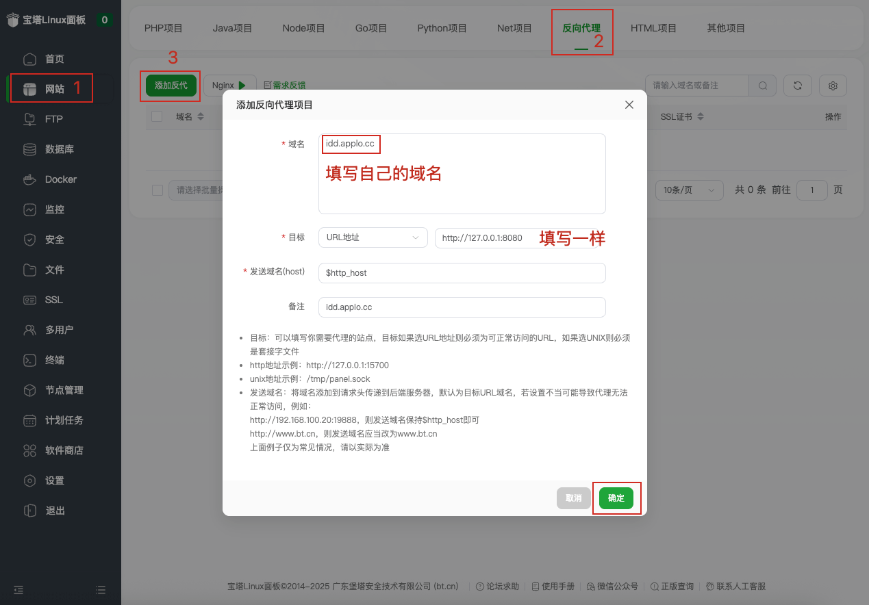 确保域名已解析到你的服务器,目标为http://127.0.0.1:8080